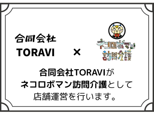 合同会社TORAVIは千葉県で介護事業所を運営しております。”介護士の立場を向上させ、業界を変えていく”という本部代表ゆーすけ社長の熱い想いに共感し、【ネコロボマン訪問介護】のフランチャイズに加盟しております。FCならではの充実した職場環境で、みなさんのご活躍と成長を後押ししていきます。